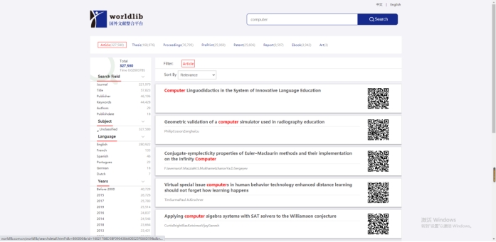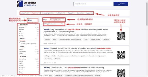 Worldlib国外文献整合平台为远程包库使用,可享受全年无限量访问下载全文数据,可随时、免费、不受任何限制地通过网络获得国外开放文献,包括经过同行评议过的期刊文章、参考文献、技术报告、学位论文等全文文献,用于科研教育及其他活动。平台整合了Doaj、GoOA、OADT等仓储数据,收录了Springer、Elsevier、Wiley、Taylor&Francis等著名出版商期刊论文全文数据。涉及经济学、法律学、教育学、计算机科学与技术、地学天文、工程技术、管理科学、化学、环境科学与生态学、农林科学、社会科学、生物、数学、物理、医学等各个学科。通过PC端和手机端两种阅读方式提供4100多万篇文献的在线全文阅读,其中期刊论文3100多万篇、博硕士论文410多万篇、电子图书130多万种、科技报告140多万篇、艺术鉴赏90万幅、会议论文125万篇、预印本150万片、专利100万篇,多种资源类型可实现一站式跨库检索。内容以英语为主,涉及20多个语种。后续会发布国外公开课、专利等各类文献,以满足不同用户对文献数据的需求。